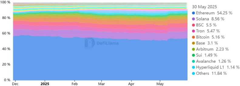Despite concerns about decreasing decentralized application (DApp) engagement, Ethereum still commands a 54.2% share of the total value locked (TVL) across all blockchains, according to DeFiLlama. Combined with layer-2s, the Ethereum ecosystem captures over 60% of the entire DeFi market, far surpassing rivals like Solana and BNB Chain.