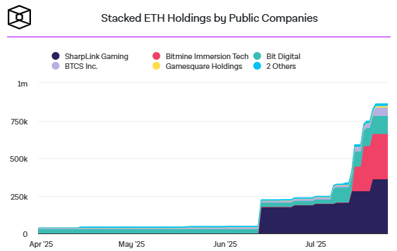 With BitMine now holding 833,137 ETH ($2.9 billion) and SharpLink managing 480,031 ETH ($1.7 billion), the landscape of Ethereum’s institutional support is rapidly evolving. These large treasuries reflect increasing trust in ETH as a yield-generating digital asset and a foundational infrastructure layer.