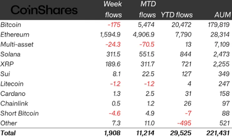 This makes ETH the dominant force in crypto fund flows for the second consecutive week, amid ongoing rotation from Bitcoin and into large-cap altcoins.