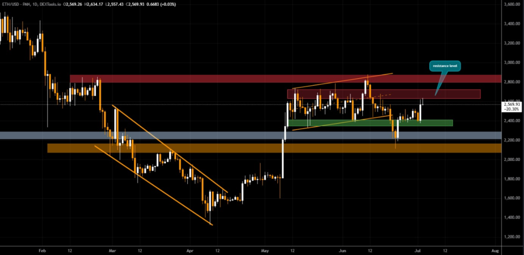 Moreover, Ethereum is forming higher lows, which is generally considered a bullish price structure. The immediate resistance lies around $2,630, and a break above this level could open the path to $2,700 or higher.