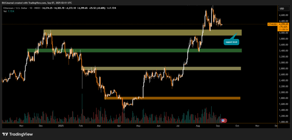 According to BITX analysts, “The $4,200–$4,300 consolidation is healthy after such a sharp rally. If ETH clears $4,600, it could aim for new highs, but a daily close below $3,800 would shift sentiment bearish.”