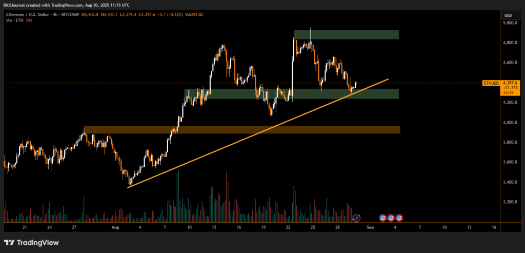 Ethereum (ETH) is currently trading around $4,397, maintaining a strong upward trendline despite recent volatility. The 4-hour chart reveals a critical support zone near $4,200, where buyers have repeatedly stepped in to prevent deeper declines. This region aligns with a rising trendline that has been respected since early August.