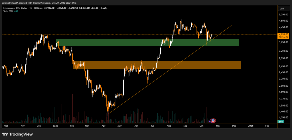 Ethereum (ETH) has reclaimed the $4,000 mark, showing renewed strength after a volatile start to October. The world’s second-largest cryptocurrency rose nearly 1.6% in the past 24 hours, reaching around $4,053, as buyers defended the critical $3,800 support zone visible in the latest technical setup.