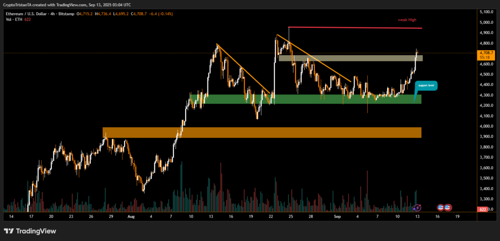 The 4-hour ETH/USD chart shows that Ethereum broke out of a prolonged consolidation phase, reclaiming the $4,300–$4,400 support band before rallying higher. The breakout has now pushed ETH into the $4,700–$4,750 resistance area, which had previously capped gains in late August.