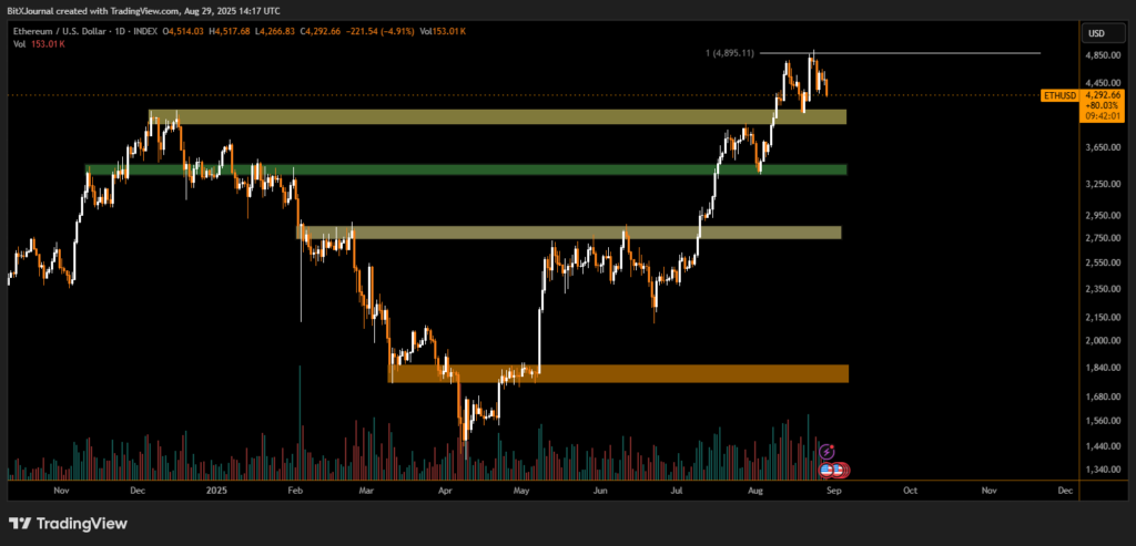 Ethereum (ETH) slipped under the $4,270 level on Thursday, signaling a potential short-term correction after its impressive rally earlier this month. The decline comes as traders lock in profits near the $4,850 resistance zone, with ETH now testing crucial support areas that could determine its next move.