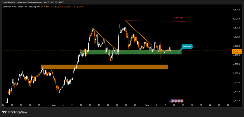 For now, traders are watching closely as Ethereum consolidates, with support at $4,300 serving as the key level to determine the next major move.