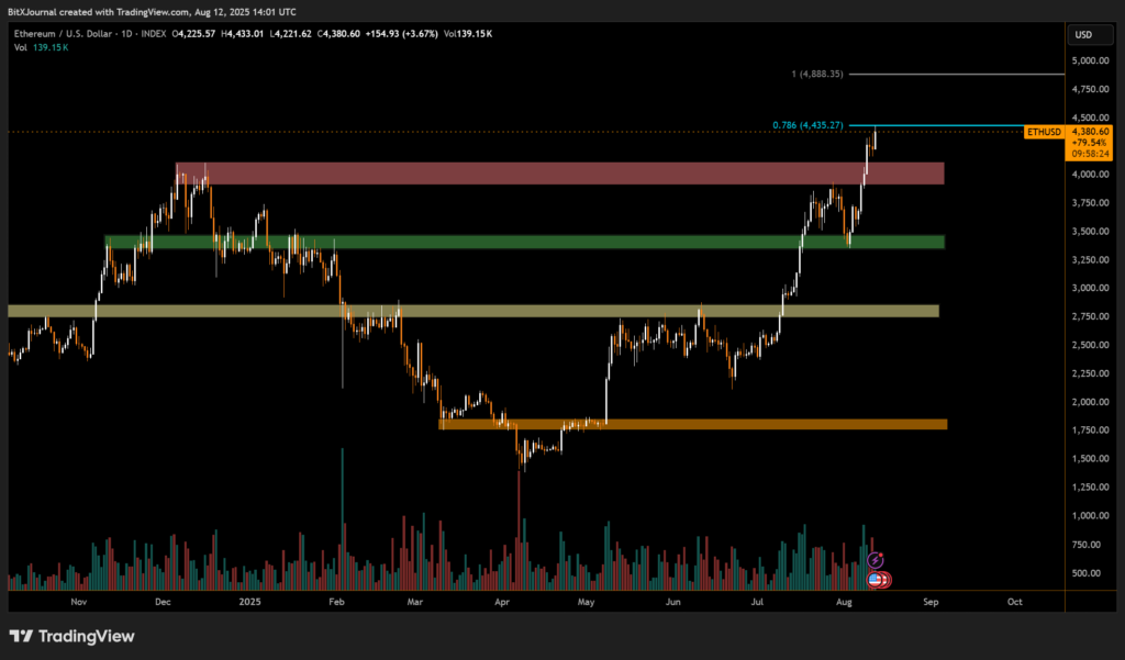 Ethereum’s rally has extended into mid-August, with the price climbing above $4,377, marking a 66% surge since July lows. The move has brought ETH close to a key 0.786 Fibonacci retracement level at $4,435, an area where some analysts expect heightened selling pressure.