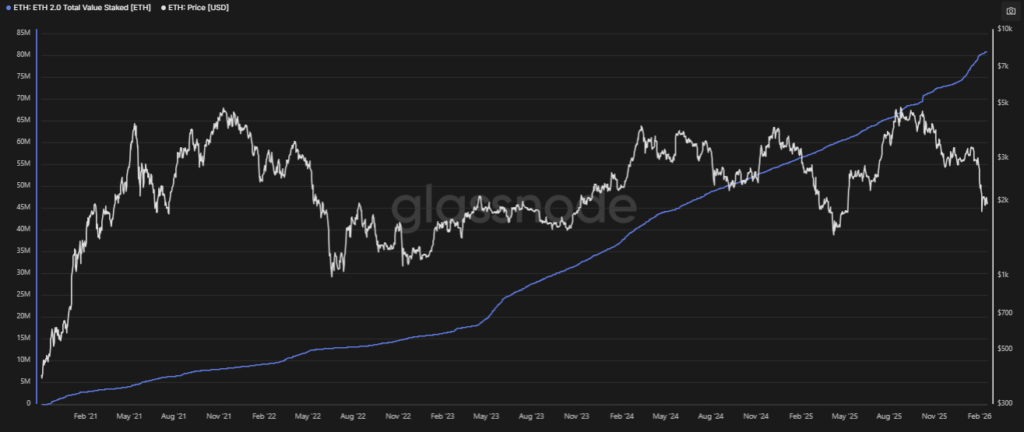Ethereum has fallen roughly 20% in February, briefly slipping below the key $2,000 psychological level. Despite the pullback, onchain metrics indicate steady long term accumulation. More than 2.5 million ETH flowed into accumulation addresses during the month, lifting total holdings to 26.7 million ETH, up from 22 million at the start of 2026.