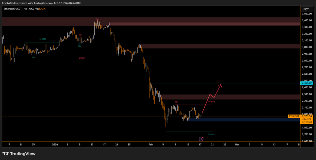 On the four hour chart, if ETH confirmed breakout above the $2,150 neckline could project a measured move toward the $2,473–$2,634 range.