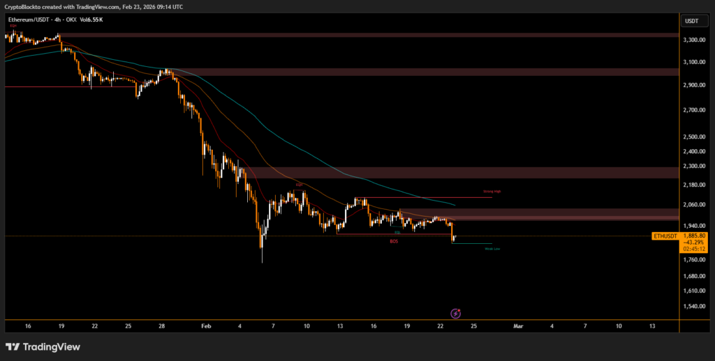 Technical indicators suggest Eth has broken down from a bear pennant formation, a continuation pattern that often signals further declines. Based on the height of the previous downtrend, analysts project a potential move toward $1,475 if selling pressure persists into early March.