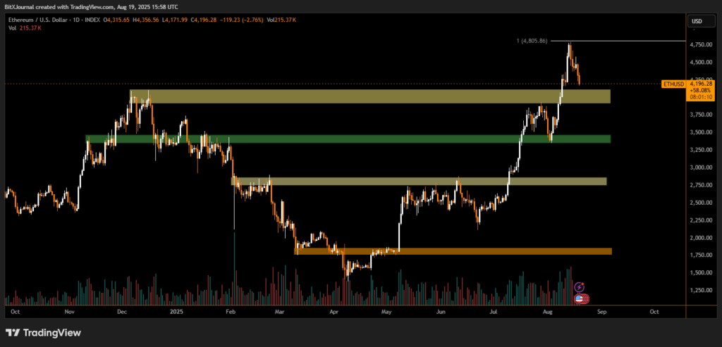 The daily chart shows Ethereum advancing from July lows near $2,800, breaking through multiple resistance levels including $3,200 and $3,750. The strong move culminated in a peak at $4,805, before sellers regained control.