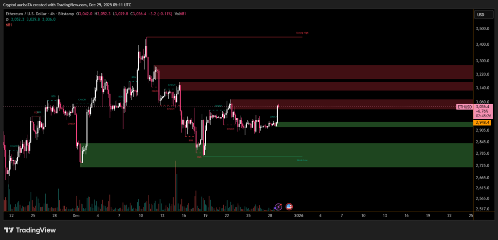 Ethereum is trading near the $3,050 level after failing to extend its recent recovery, according to the latest market data. While buyers attempted to reclaim higher prices, selling pressure near a well-defined resistance zone has capped upside momentum. The broader setup suggests Ethereum is currently in a consolidation phase following a sharp corrective move.
