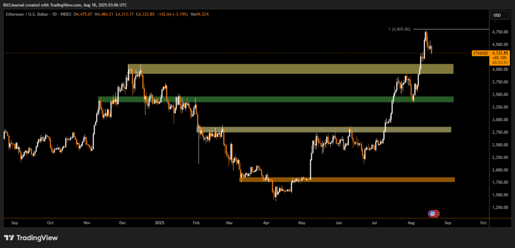 On the upside, ETH faces resistance around $4,750–$4,800, the level where profit-taking began last week. Traders say a decisive close above this zone would open the path toward psychological resistance at $5,000.