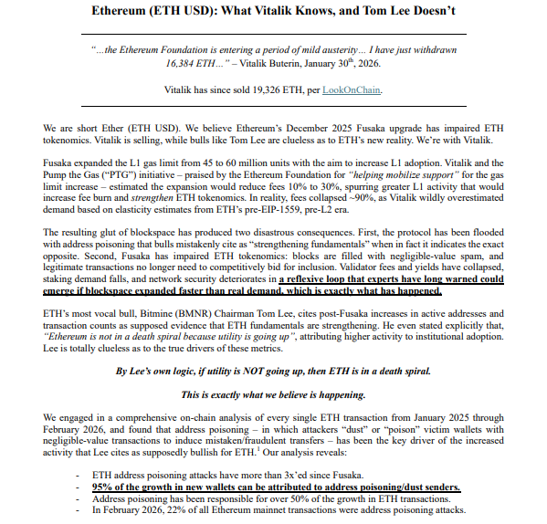 A new report from short selling firm Culper Research claims that the December 2025 Fusaka upgrade on the Ethereum network has weakened the economic model supporting the second-largest cryptocurrency. According to the report, the upgrade significantly increased available block space, which sharply reduced transaction fees across the network.
