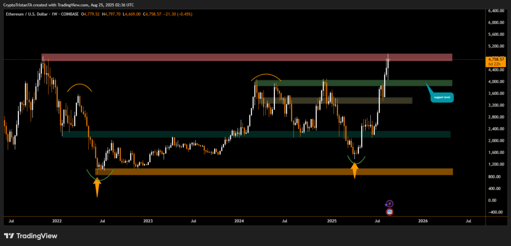 The chart highlights a critical resistance zone around $4,950 to $5,200, which has historically acted as a barrier during previous rallies. A decisive weekly close above this zone could confirm a bullish continuation pattern, potentially opening the door for Ethereum to target new all-time highs.