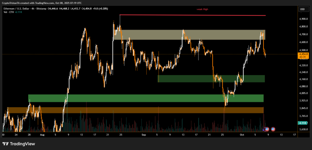 At the time of writing, Ethereum (ETH) trades near $4,430, down 6% on the day but holding above a key support level around $4,400. Analysts say this zone could serve as the launchpad for the next leg higher, particularly if monetary policy continues to ease.