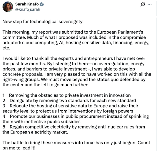 The European Parliament is preparing to vote on a major proposal for technology sovereignty, marking a potential turning point for Europe’s digital competitiveness. The initiative, led by the Committee on Industry, Research and Energy (ITRE) and backed by pro-Bitcoin lawmaker Sarah Knafo, aims to position Europe as a global player in digital infrastructure and innovation.