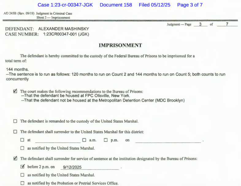According to court filings from the U.S. District Court for the Southern District of New York, Mashinsky must surrender to authorities by 2:00 p.m. ET on Friday. The court has recommended that he serve his sentence at the Federal Prison Camp in Otisville, New York, a minimum-security facility located about 75 miles from New York City.