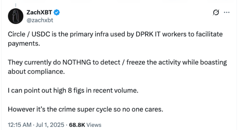 The discussion intensified after crypto analysts flagged that DPRK-affiliated IT workers are leveraging stablecoins like USDC to bypass sanctions. While Tether has frozen over $225 million in scam-related USDT, critics argue that Circle’s USDC activity lacks comparable oversight.
