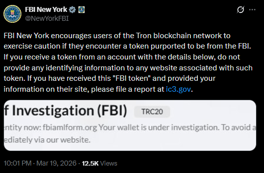 The Federal Bureau of Investigation has issued a warning about a phishing scam involving a fake token on the Tron network. The fraudulent token impersonates the agency, attempting to trick users into revealing sensitive information.