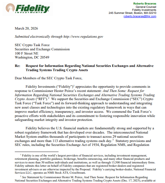Fidelity Investments has urged US regulators to expand guidance allowing broker dealers to offer, custody and trade crypto assets through alternative trading systems. The firm emphasized that a clear regulatory framework is essential for supporting tokenized securities issued by third parties and enabling broader participation in blockchain-based markets.