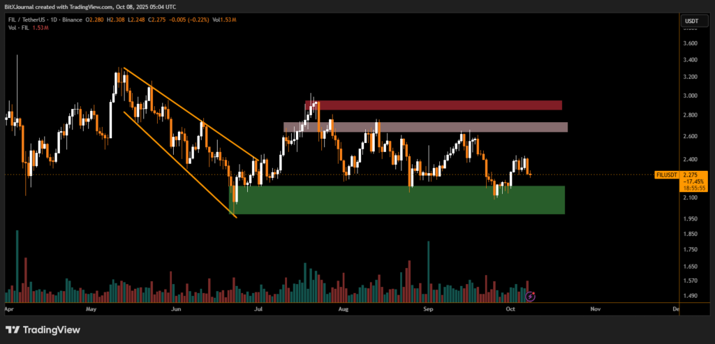 FIL struggles to hold key support after failing to reclaim the $2.40 resistance zone
