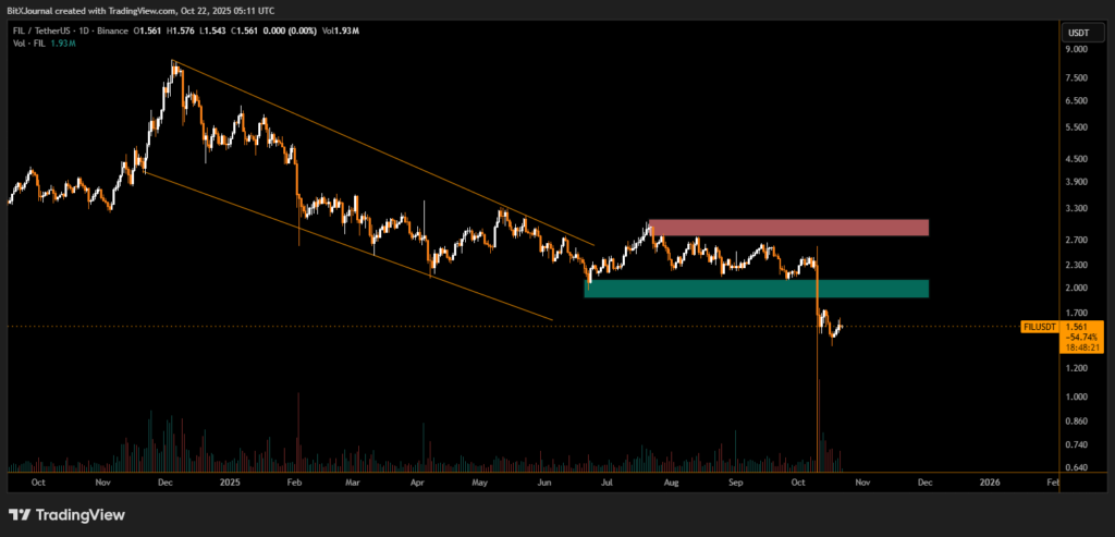 The daily chart reveals FILUSDT attempting to stabilize after a dramatic correction that erased over 50% of its value in October. Price action shows the token trying to recover from a critical support area between $1.45 and $1.60, while facing resistance at $2.10–$2.40, highlighted in green and red zones on the chart.