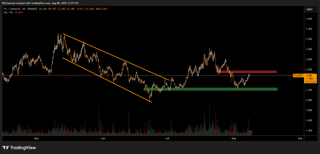 The 4-hour chart highlights a clean break above a falling wedge pattern, a technical formation typically associated with bullish reversals. After bottoming near $2.20 — a historically significant support zone — FIL rallied sharply, currently trading at around $2.48.
