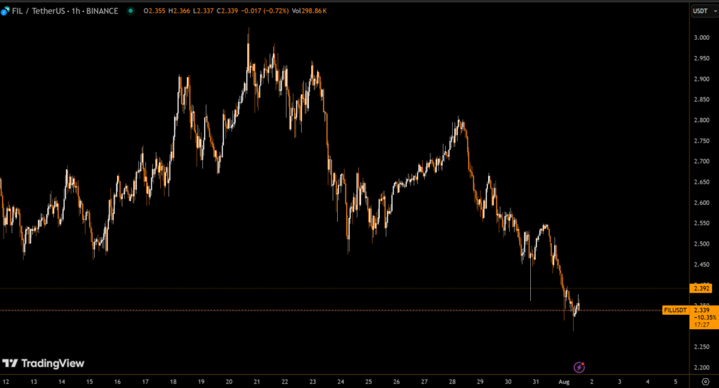 Filecoin (FIL) witnessed a sharp sell-off on August 1, 2025, as bearish pressure intensified across the cryptocurrency market. The token broke below a key technical support level at $2.38, triggering heightened volatility and sell-side volume spikes.