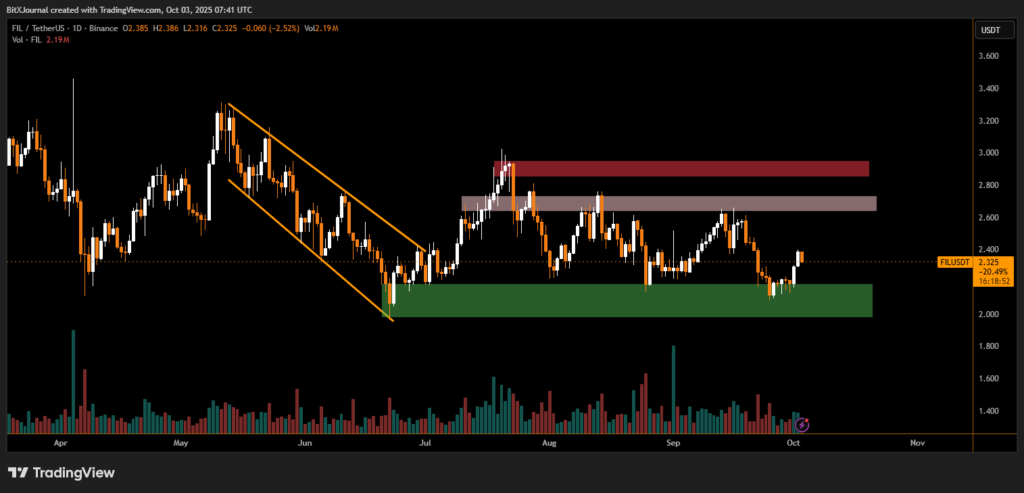 The daily chart shows that FIL found strong buying interest near the $2.10–$2.20 support zone, marked by high-volume demand in recent sessions. This region has repeatedly acted as a major floor for buyers, preventing further downside.