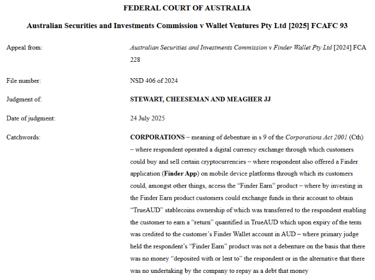 The decision, delivered by Justices Stewart, Cheeseman, and Meagher on Thursday, upheld a previous judgment that Finder Wallet and its Earn product complied with financial laws. The court confirmed that Finder Earn did not constitute a debenture or other regulated financial instrument.