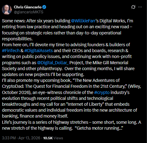 Chris Giancarlo, the former head of the Commodity Futures Trading Commission, has announced he is stepping away from legal practice to focus fully on advising cryptocurrency and fintech companies. Giancarlo revealed that he is leaving the law firm Willkie Farr & Gallagher and retiring from law to support founders, executives and boards working in digital finance and emerging technologies.