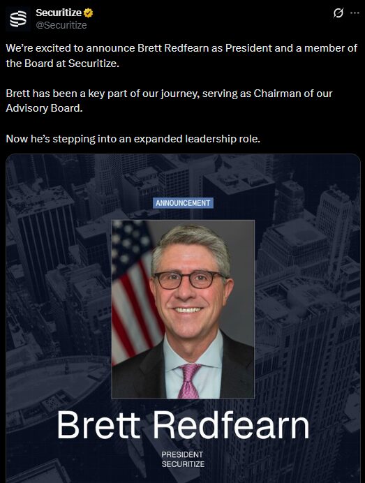 Digital asset tokenization firm Securitize has named Brett Redfearn as its new president and member of its board of directors. The company announced the appointment on Thursday, noting that Redfearn previously served as director of the Division of Trading and Markets at the US Securities and Exchange Commission.