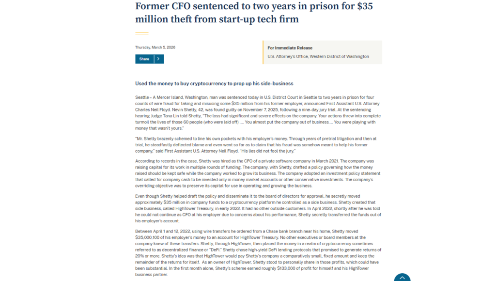 According to the U.S. Department of Justice, Shetty secretly transferred approximately $35 million from a Seattle-based technology startup into a cryptocurrency platform he controlled called HighTower Treasury. The transfers took place in 2022 without the knowledge of company executives or board members.