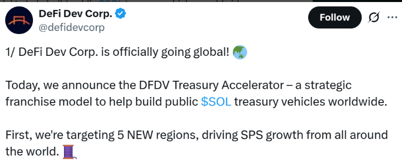 The newly launched DFDV Treasury Accelerator aims to establish regional SOL treasuries across the globe. This is a strategic shift from centralized treasury models and will enable faster global deployment of capital, validator infrastructure, and fundraising capabilities.