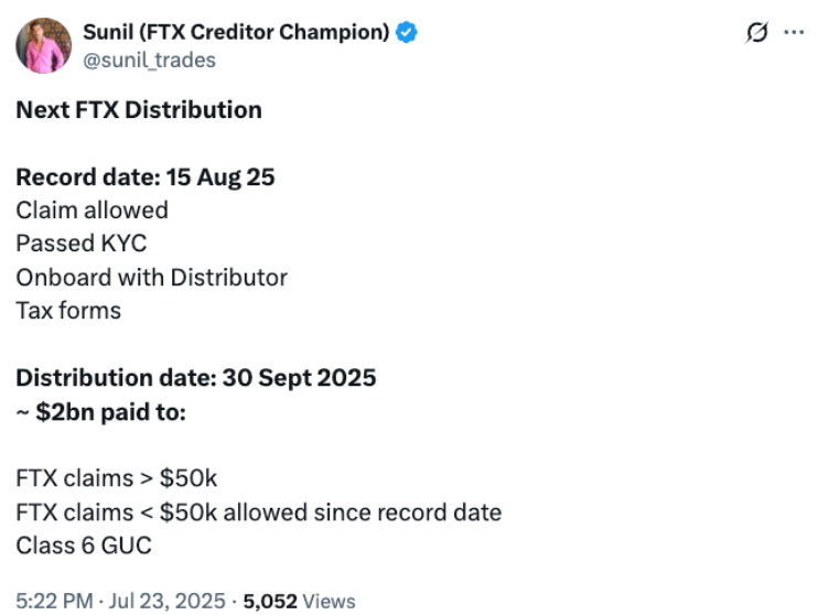 According to the FTX Recovery Trust, eligible claims will be finalized based on records as of August 15. The funds for this new round come from a reduction in disputed claim reserves — from $6.5 billion to $4.3 billion — authorized by the bankruptcy court. This adjustment released $1.9 billion for immediate redistribution.