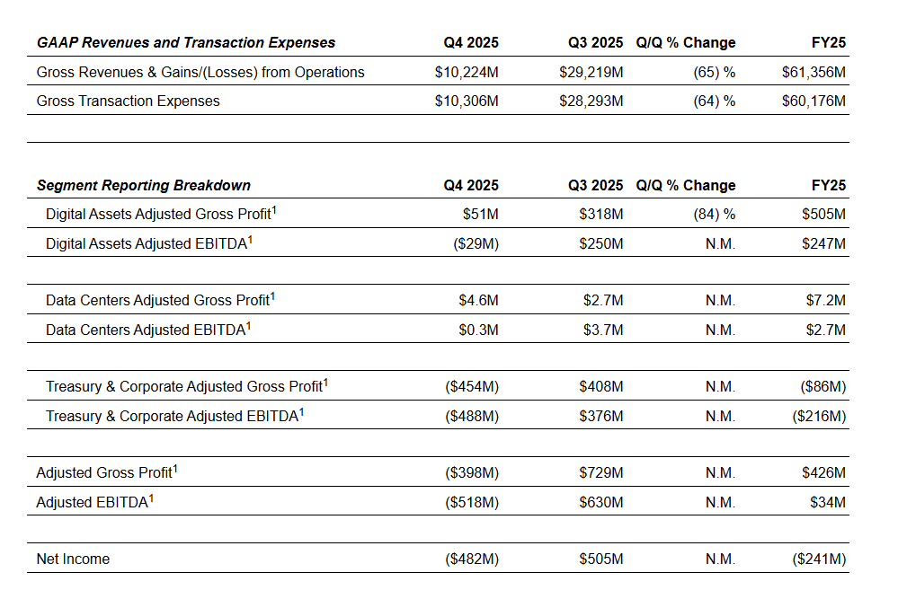 Galaxy Digital reported a net loss of $482 million in the fourth quarter of 2025, contributing to a full-year net loss of $241 million, as weaker digital asset prices weighed heavily on its balance sheet. The company said fourth-quarter results were primarily affected by falling cryptocurrency valuations, with Bitcoin declining roughly 20% during the period.