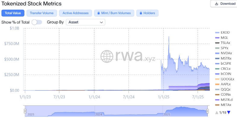 Now, public equities are entering the mix, with industry data showing the total value of tokenized stocks at around $341 million.