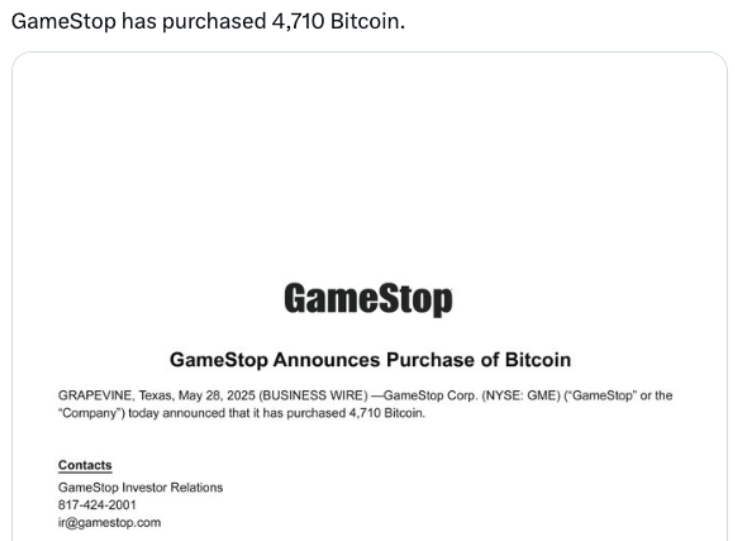 In a major strategic shift, GameStop has officially confirmed the purchase of 4,710 Bitcoin, marking its first major foray into cryptocurrency. The announcement was made via the company’s official X (formerly Twitter) account on May 28, following weeks of speculation about the retailer’s alternative investment strategy.