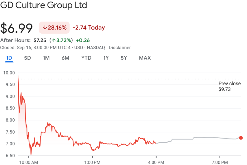 GD Culture Group (NASDAQ: GDC) shares tumbled 28% on Tuesday, closing at $6.99, after the livestreaming and e-commerce company announced a deal to acquire 7,500 Bitcoin valued at roughly $875.4 million from Pallas Capital Holding.