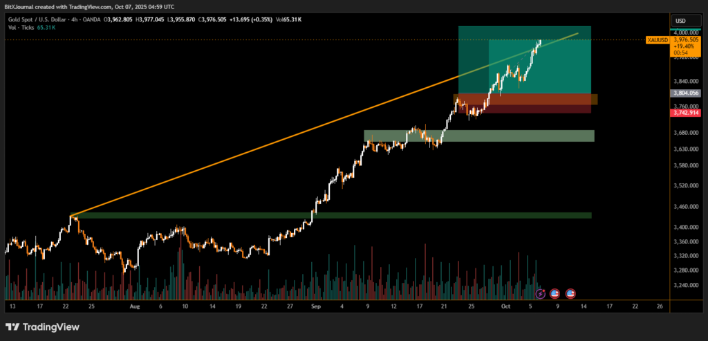 The near-$4,000 gold rally is not just a milestone for commodities — it’s a signal of investor distrust in fiat stability. As governments expand fiscal debt and central banks print more money, both gold and Bitcoin are becoming key refuges for capital preservation.