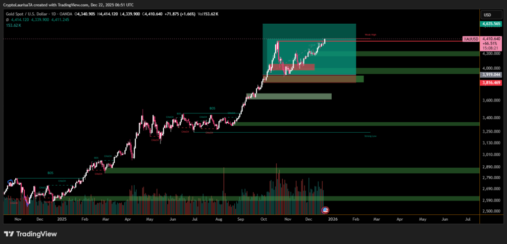 From a technical standpoint, gold remains firmly within a bullish price structure, characterized by higher highs and higher lows. The recent push above the $4,400 resistance zone signals acceptance at elevated prices, with former resistance now acting as short-term support.