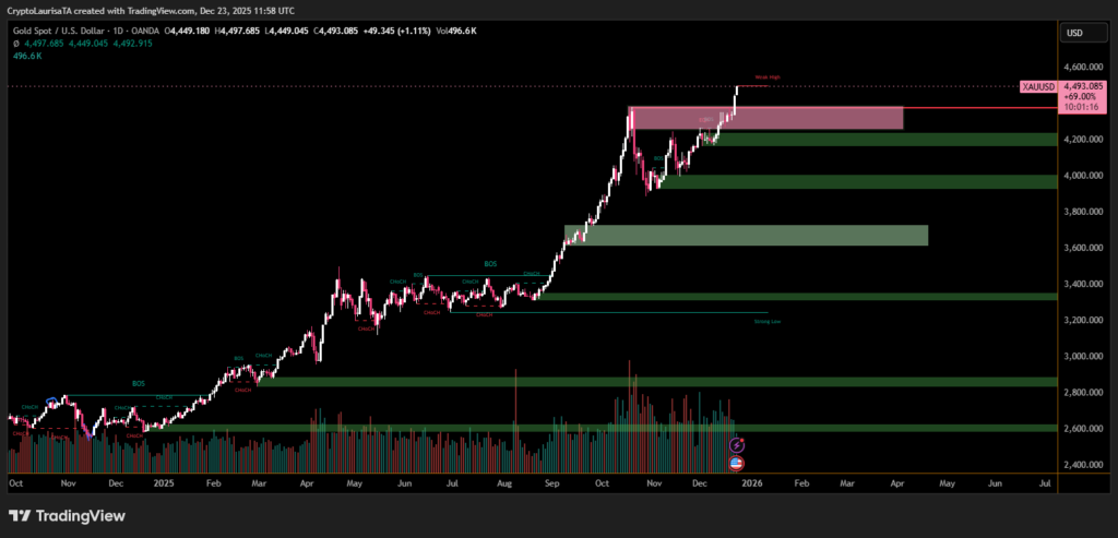 Gold prices continue their powerful rally, climbing to a fresh all-time high above $4,491 per ounce, placing the market within striking distance of the $4,500 psychological level. The surge reflects a combination of escalating geopolitical risks, shifting monetary policy expectations, and sustained institutional demand.
