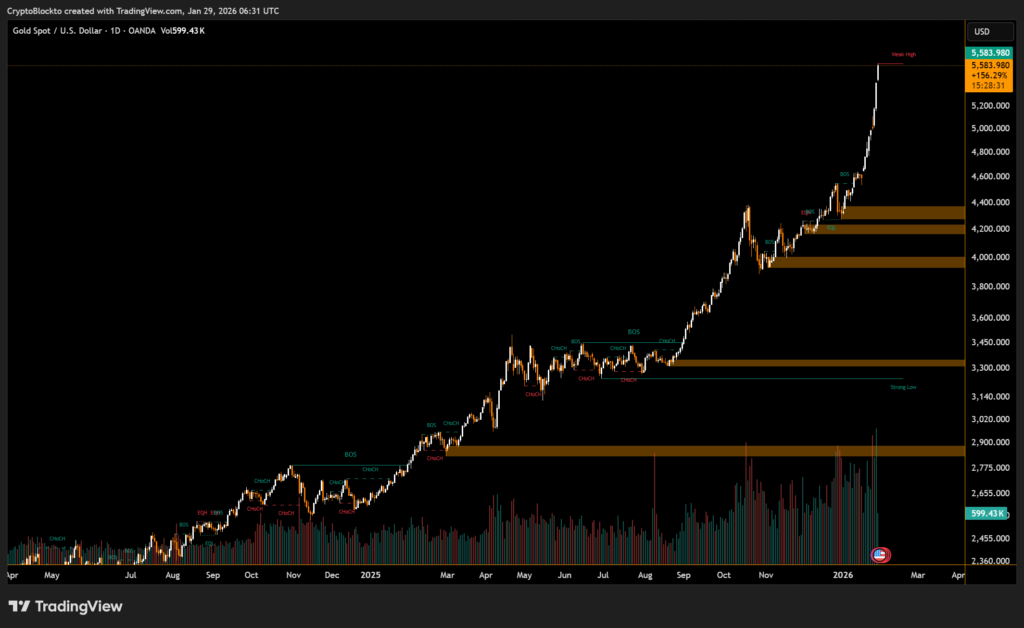 Gold breached $5,500 per ounce, bringing its total market cap to $38.77 trillion, while silver also gained 21.5% over the past week, reaching $6.6 trillion. Analysts attribute the multi-month precious metals rally to the ongoing “debasement trade”, as investors seek safe havens amid monetary expansion and fiscal uncertainty.