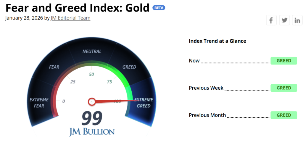 The Crypto Fear & Greed Index currently reads 26 out of 100, signaling fear in the Bitcoin market. In contrast, gold’s Fear & Greed Index is 99, showing extreme greed. The data underscores a stark contrast in how investors approach precious metals and cryptocurrencies in the current economic environment.