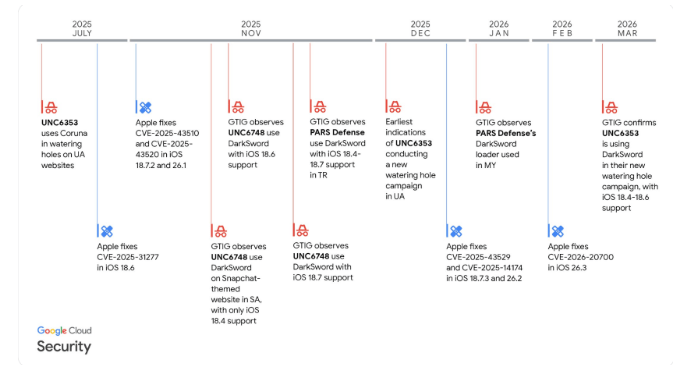 A timeline of the evolving malware threats targeting Apple iOS devices and the cybersecurity patches released to address the threats.: Google Threat Intelligence