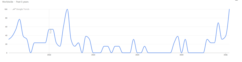 Global searches for the phrase “Bitcoin going to zero” have climbed to their highest level since November 2022, when the collapse of FTX triggered widespread panic across digital asset markets. The renewed spike in search activity comes as Bitcoin trades near $66,500, down nearly 50% from its October 2025 all-time high of around $126,000.