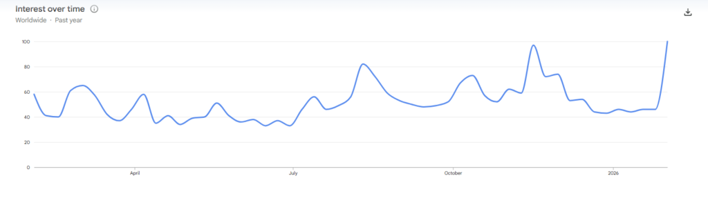 Online interest in Bitcoin has surged sharply as dramatic price swings push the cryptocurrency back into the public spotlight. Data from Google Trends shows a spike in searches for the term “Bitcoin” during the first week of February, coinciding with a steep market sell-off and subsequent rebound.