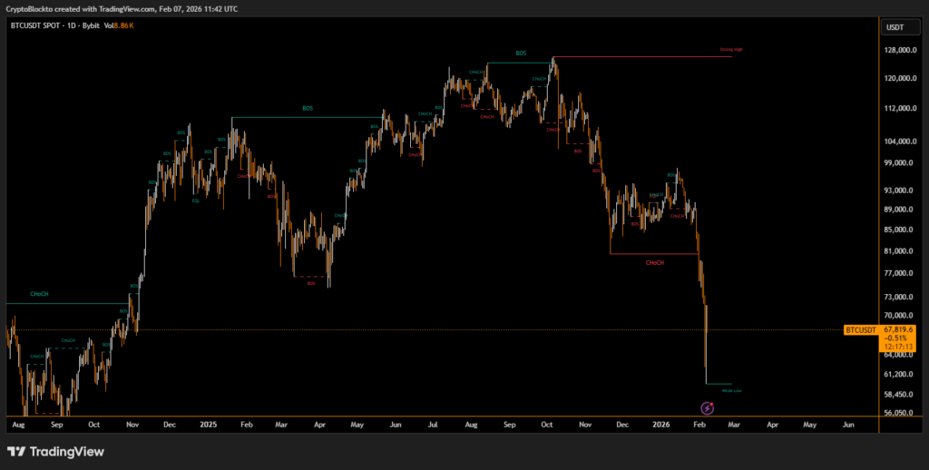 Worldwide Google search activity for “Bitcoin” reached its highest level in the past year, hitting a score of 100 during the week starting Feb. 1. This surge followed a rapid decline in Bitcoin’s price from roughly $81,500 to near $60,000 in a matter of days, marking its lowest level since October 2024. The asset later recovered to around $70,700, but remained down more than 15% over the week.