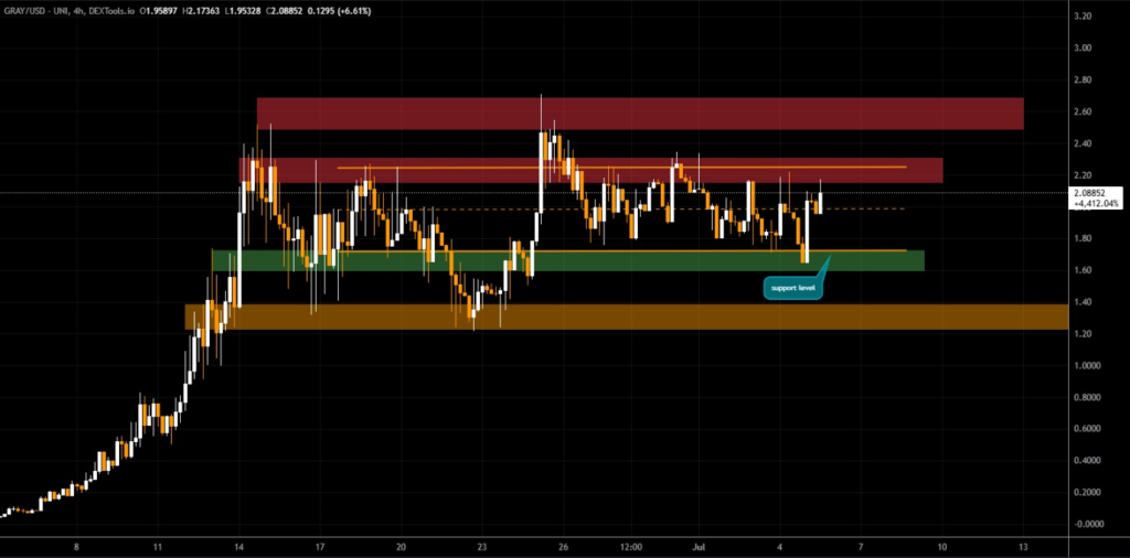 GRAY has declined nearly 26% from its all-time high of $2.69, recorded in late June, indicating profit-taking and market recalibration. Despite this, the asset has shown signs of resilience as trading volume remains steady, suggesting that buyers are still active.